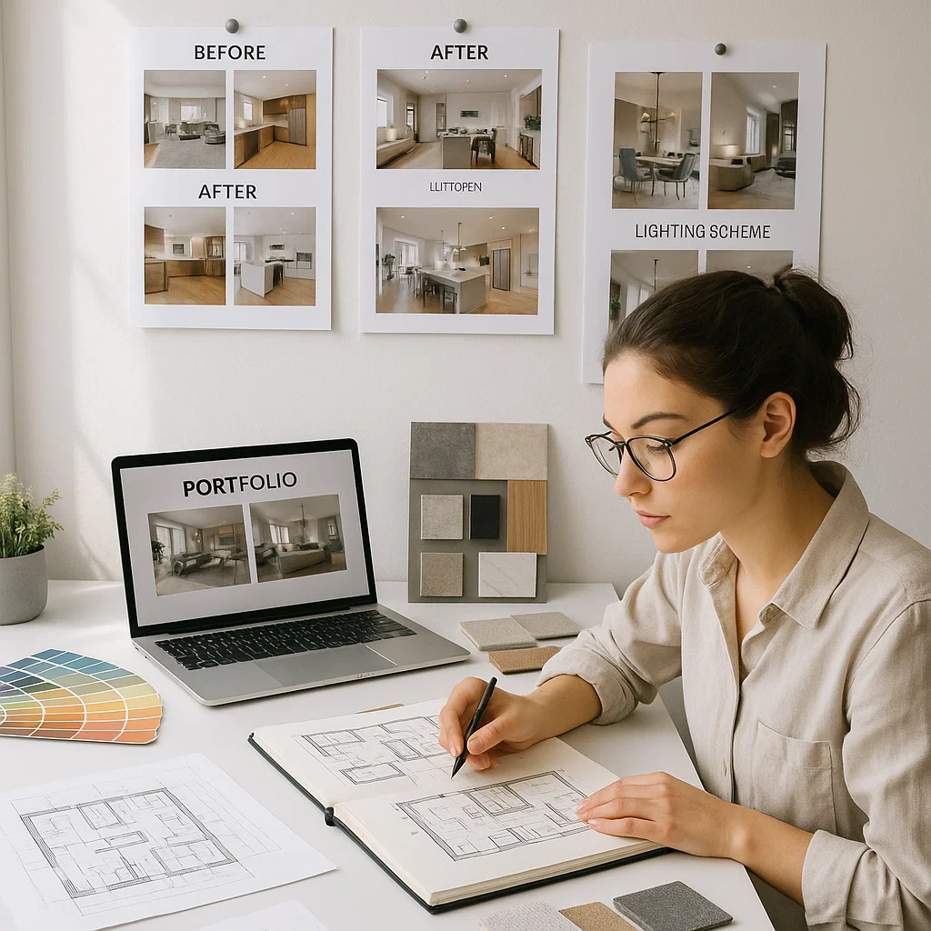 Focus on building projects that showcase space planning, materials selection, lighting design, and client presentation abilities. These core competencies form the foundation of professional practice.