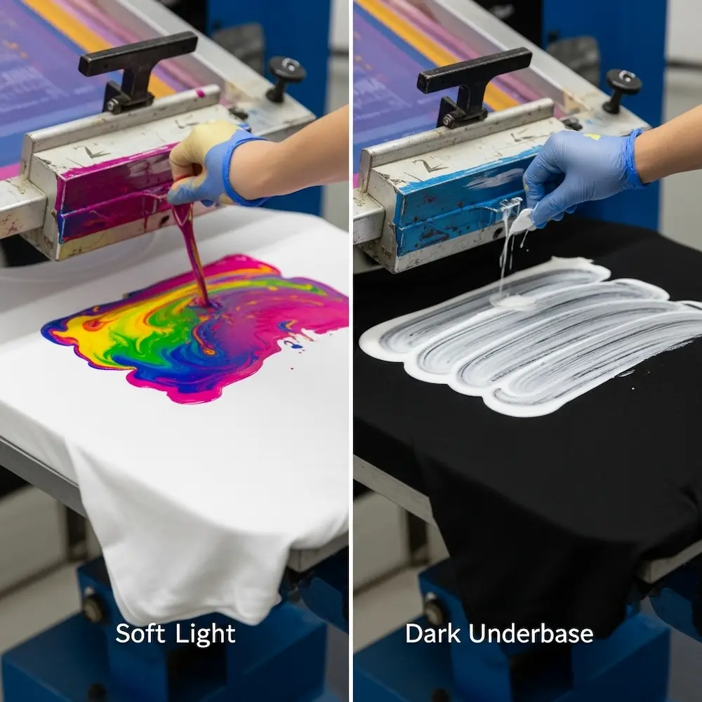 White underbase requirement represents the fundamental difference when printing on dark shirts. The Fibre2Fashion article explains: “While printing on dark colors of garments a separate screen of white under-base is highly recommended. The under-base keeps the top viewed colors from blending with the dark background garment dye which produces a muted image color known as bleeding”. Without underbase, colored inks mix optically with dark fabric, creating muddy or completely invisible results. The article notes critically: “And if white ink is not one of your design colors, and then you need to ADD this white screen to the total colors in your design – can increase you costs”. A three-color design on dark fabric effectively becomes four colors (white underbase plus three top colors).